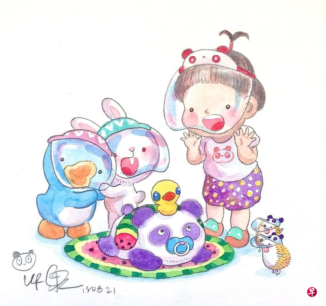 一回到家按捺不住喜悦,将原本安排好写专栏的工作缓一缓,改而拿起画笔立即创作一幅小插画,分享熊猫宝宝到来的欢愉。从打底稿,勾描线条到水彩上色,一切速战速决,分享出去后无数网友都留言打趣说:也未免太快了吧?