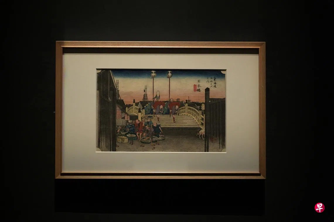 第二重惊喜是,展品题材丰富。我还在展览中看到了铃木春信的一幅“见立绘”《涂桶暮雪》。“见立”意为“变体”,有将原有事物引申为另一类完全不同的事物的意思。“见立绘”通常用前人画作来进行新的创造,使本来互不相干的事物之间充满微妙的关联,令画面呈现丰富的隐喻。展品旁的介绍文字说:《涂桶暮雪》这个名字脱胎于日本著名山水画《江天远意图》。后者向古代中国画致敬。