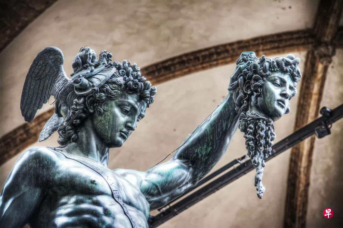 有意思的是,纽约曼岛下城区,收集池(Collect Pond)公园中央,美杜莎赤身裸体,一手持剑,一手拎着珀尔修斯的头颅。“提着珀尔修斯头颅的美杜莎”,这座雕塑作品足有两米高,美杜莎标志性的蛇发垂在脖颈一侧,她拎着敌人尸首的胳膊消瘦,隐约显出肌肉的线条与用力时突出的青筋。