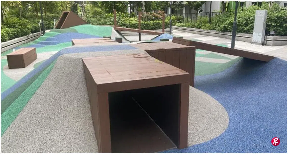 我到新建组屋区的游乐场时,见到了看似简单的游乐场。这个游乐场不见任何滑梯,只有几个“小山丘”、木制隧道和简单的绳索。它没有鲜艳的颜色,更没有常见的游乐场架构让孩子们爬上爬下。它唯一特别的地方就是小小的蹦床,让大人孩子都能站在上面蹦蹦跳跳。