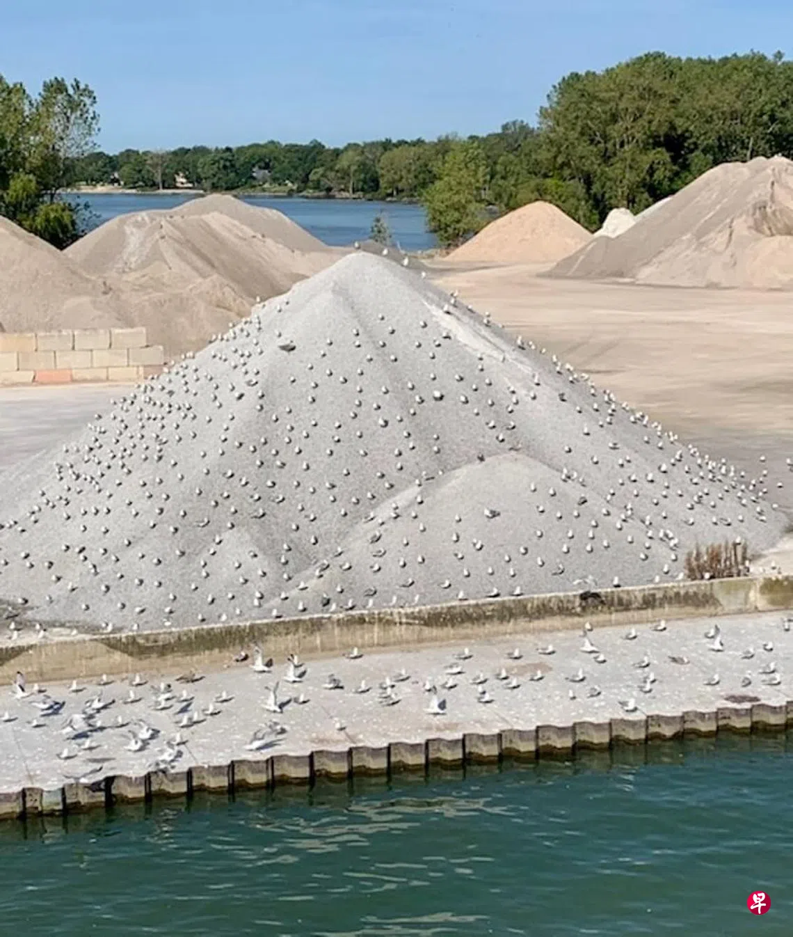 在船舷回望码头,瞬间被一幅图画震惊了:一座银色圆锥体像小型的埃及金字塔,无数白色凸起物长满刀削般表面,如奇异的大型雕塑。忽而有个白色物体飞起来了,盘旋,离去,其他的仍纹丝不动。