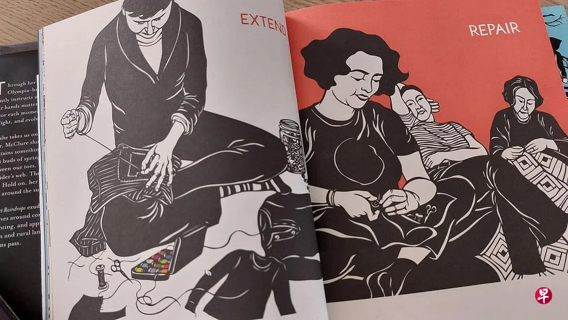 在阿拉斯加小镇凯奇坎(Ketchikan)曾偶遇一家书店,1万人的小小地方有书店,不再特别惊奇,因为那之前在更小的市镇里已邂逅另一书店。在凯奇坎买一本书,名为《收集雨滴——采集季节》,一位美国艺术家的纸刻作品。四季为篇章,每一季有若干作品,有趣的是,作品内容及题目都以人在一年不同时候相应天候所做的事情。例如在冬篇章里,一幅《建设》,人们围巾毛帽一副冬装,又扛又拉着树干。《我们是星光》,黑暗冬夜里三人围在篝火旁,漫天星斗。《储存力气》画面只有拼布被单下露出来的两只脚。冬至春来,春篇章里《新物质主义》,年轻母亲抱着幼儿,花朵满树。《拯救》里一地残枝,露出几多绿叶,有人提着浇水桶正走过来。《延续》则是干草堆上一个鸡蛋。题目为《唱一首催眠曲》的作品不需要描述,开动想象吧。