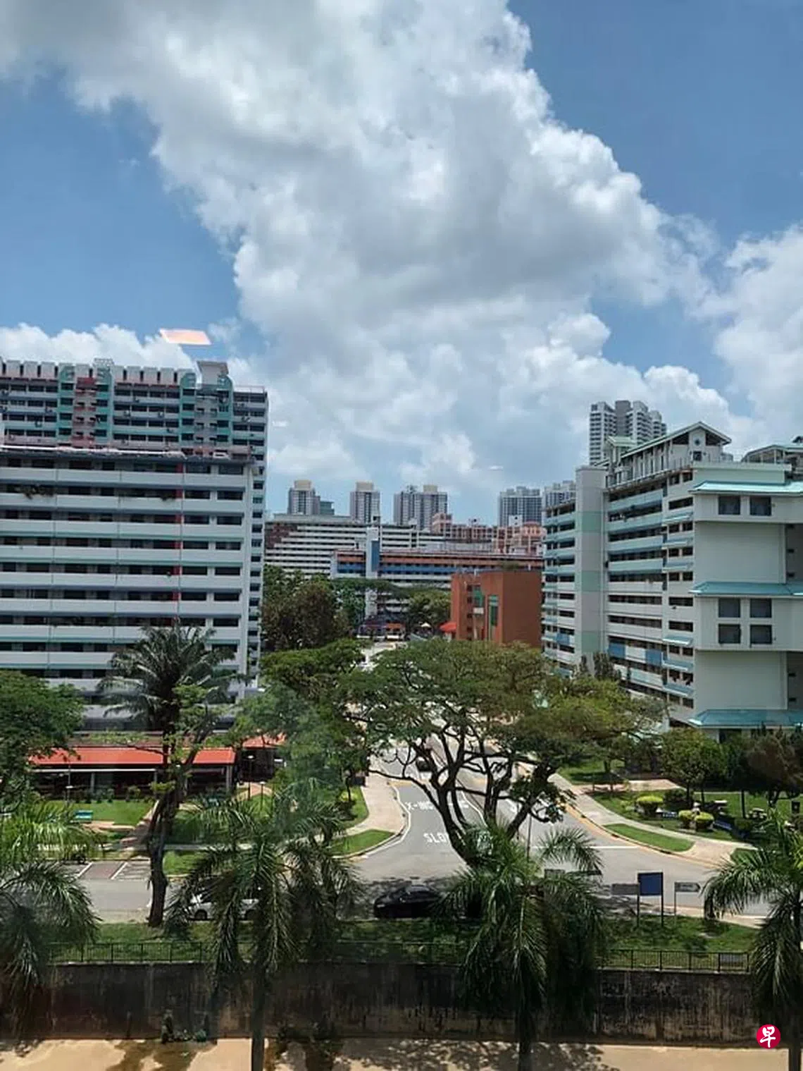 从这里,可以看到大巴窑1巷以南的组屋林立。排在前面的是一座长条形组屋,外墙被漆上大条的天蓝色和鲑鱼肉色;它是当中最旧款的,却因为跳脱的颜色,格外显眼。它后面,是不同年代组屋的大汇集。在最远处冒出头来的,是几座淡粉色、有几十楼高的新组屋。这样子新旧房子交叠的视觉效果,竟然很漂亮。看着看着,有一种亲切感油然而生。