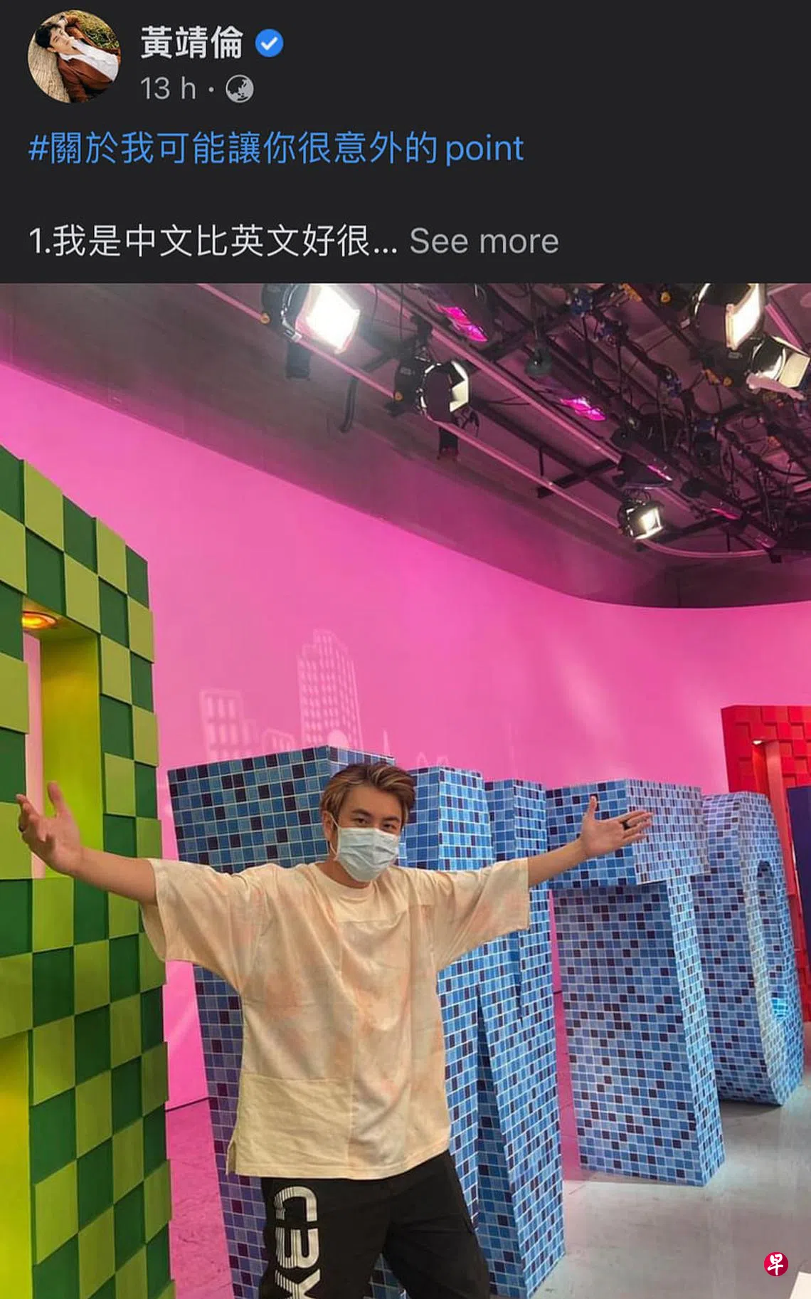 前晚在面簿看到本地艺人黄靖伦的发文,他标注“#关于我可能让你很意外的point(要点)”,列出12项有关自己,鲜为人知的大小事情,包括“我是中文比英文好很多的新加坡人”“我有人群恐惧症,我连打电话订位都不敢”“我在新加坡拍戏是演台湾人,我在台湾拍戏是演新加坡人”“每天晚上都会坚持跟老婆用餐,除非有工作”等。