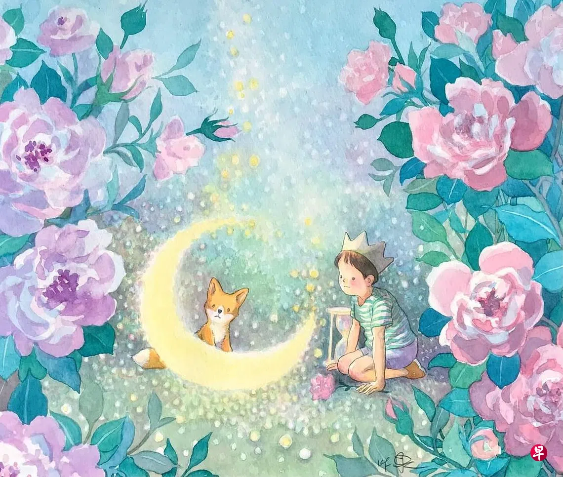 我真的画过好多以月色为意象的插画,具体多少,不曾认真统计。粗略计算,每年元宵与中秋,都会至少各画一幅,若按一年三幅而言,那10年来起码不下30幅月光图了。欢快的,忧郁的,暖心的,悠远的,梦幻的,绮丽的,浪漫的,同样的月色,不同的画意。家中挂画的小空间,倚着长桌一端摆在地板上的,是一幅当时在韩国完成的水彩画,后也收录在绘本《寻找》里头。画的也是明月,韩国原州山里的圆月,月华银白如霜,透过偌大的落地窗,奢侈地洒入房里,照亮一夜失眠的心房。当年韩国友人看了画作,灵机一动给画作取了诗一般的题目,就叫Moon Room月光房子。我把月光收集在画作的房子里,从韩国带了回来,搁在而今生活的一隅,静静地,就如同收藏着今生某一夜某一回曾经真真切切领略过的白月光。