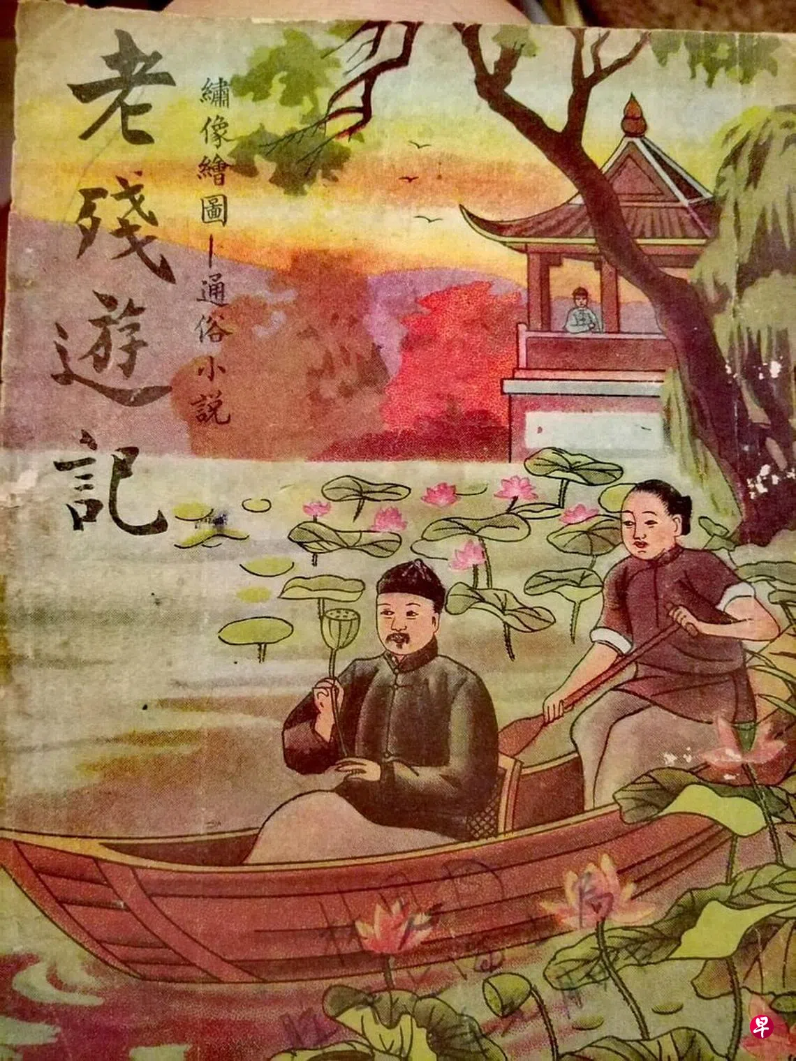 后来看新派连环图,更进一步把五四文学如家春秋画出来。其实我那时觉得有一本薄薄的《微神》,王书朋绘画,简直是幽深暗黑的爱情故事,一帧帧阴沉蓝黑的图画,不是蓝袍子,就是黑棕长衫,天色黯淡,灯光也昏昧,他眷恋着她,她记挂着他——几番年月,不只是沧桑,而是不堪和难堪。她沦落了,成为街灯下的神女,从前种种不须再提,变成苦涩的回忆。等到她死去,打胎,顺便也自杀……她的芳魂才翩翩归来。凄然的说,从此住在你的心里。仿佛回到过去,肉体烂化了,她容颜却不会老。如魅似梦的小说,我印象深刻,一直记得,老舍竟然把这小故事写得诗意而感人——比起《月牙儿》多了一分柔婉。“……爱情的故事永远是平凡的,正如春雨秋霜那样平凡……”老舍暂时舍弃过去的京腔,难得文艺抒情起来,他的短篇用了《微神集》做书名,显然他偏爱这一部。而旧小说的《老残游记》文笔是被人称赞的,以前课本专门撷取黑妞白妞说书的部分,大概是觉得值得欣赏的,可就等于是文字博物馆展示的范文,镶嵌着玻璃箱,人们接近不了——到底一般人重回章回小说的八阵图,是不懂得勾留盘桓,信步而观,片刻的沉溺的。那种人迹声影,景物分明,随即写事写情了。这种悠闲淡然已经失传。如今见旧版老残,绣像图,石印字体奇小,封面却叫人神往不已:八角亭外,湖水里有小舟,身后船娘划桨,老残坐着,手持莲蓬,船沿莲叶莲花大如斗。套色的淡绿桃红,一片柔和粉艳。呼应着原文:……现在正是开花的时候,一片白花映着水气的斜阳,好似一条粉红绒毯……”然后写的就是一片声音,两边荷花荷叶将船夹住,擦得船嗤嗤价响,水鸟被人惊起,格格价飞,老残随手摘了几个莲蓬,一面吃着,一面船已到了鹊华桥畔。而我们却隔着时间的莲池,茫茫的天地,落差的时空,扑面而来的现实,只有尾随文字,追想老残的游兴——晚清的大明湖,永恒的存在其中,年月停滞在那个时刻,莲花朵朵,船身摩擦着莲叶,斜阳余晖,水光幽幽。我暂且穿过去,憩息流连,要多久就多久,时光年年依旧妩媚。