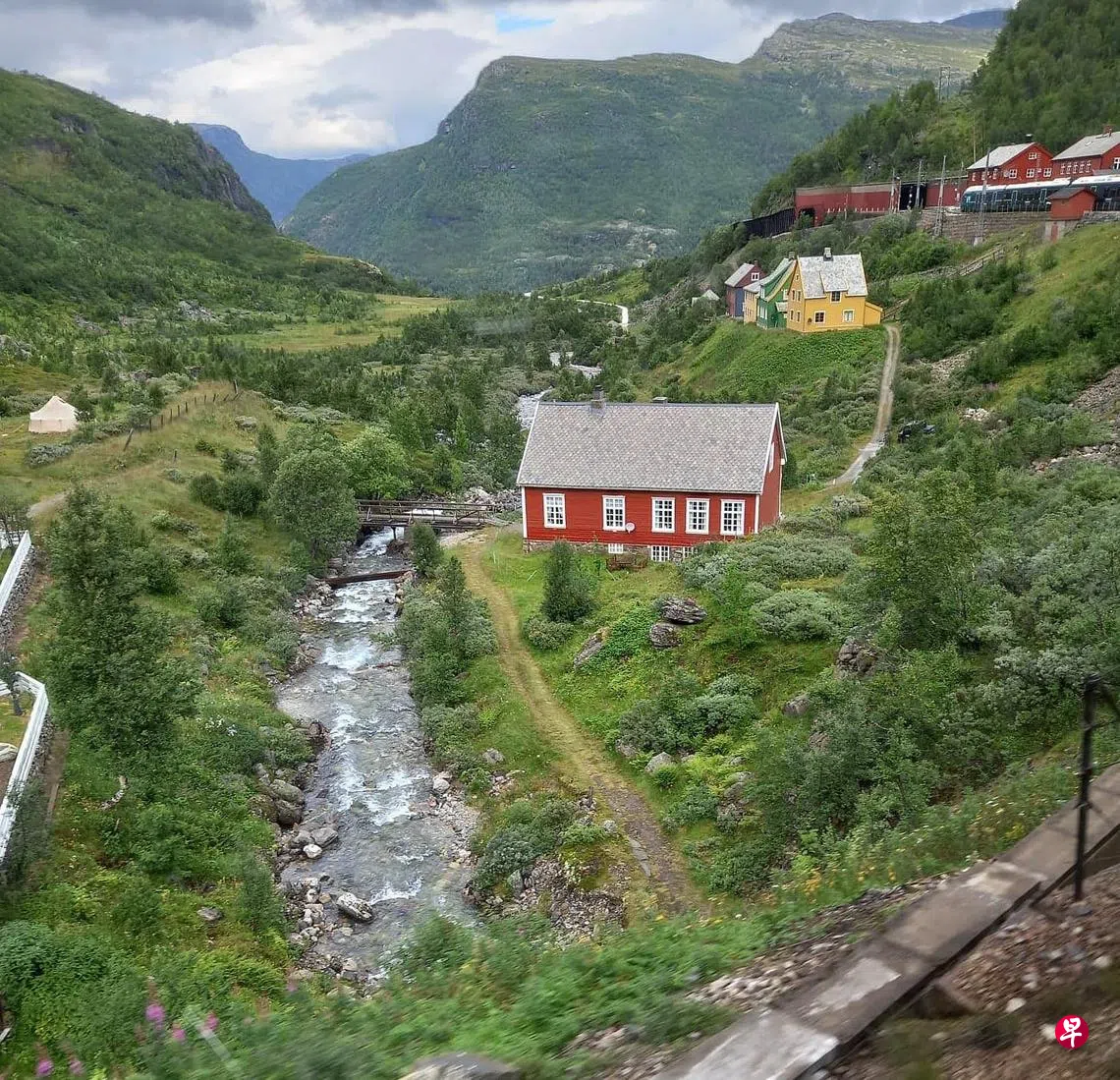 当时列车刚驶过北欧海拔最高的火车站芬瑟。从窗口俯瞰,小木屋位于陡峭的山丘,周遭也有一些房子,远处有建筑物较密集的小镇。