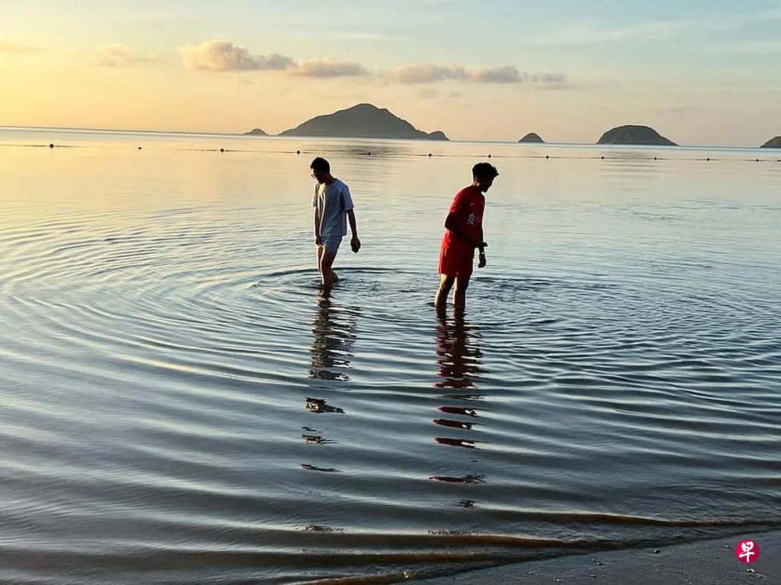 岛上日出6点钟,我必须在5点三刻起床,骑车到海边的时间刚好。当时刚好退潮,几个当地青年刚好走进浅水,用嬉笑踢出涟漪,抹上了金黄阳光的一圈圈的波峰,由他们的小腿出发,散发开来,一切终将归于平静,发生了却又什么都不曾发生,就在这一瞬间,我按下了手机的快门,成了照片。
