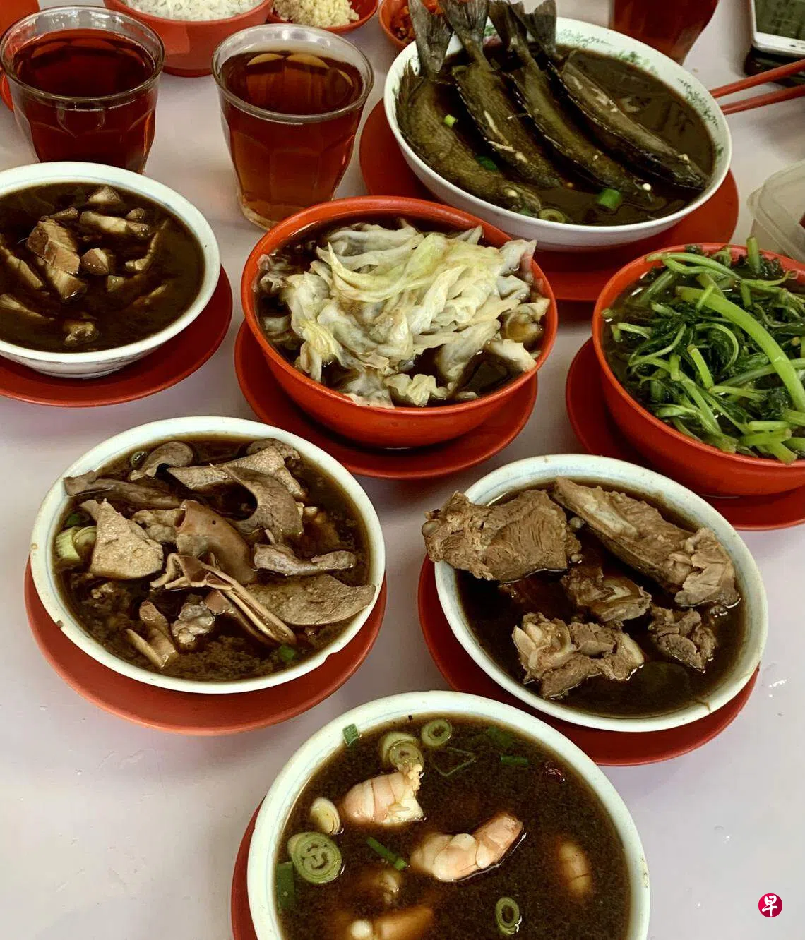 飞抵山打根正是中午,我们被直接带到一家名为“好味”的肉骨茶餐馆。店面朴素,东南亚常见的敞开式,大约久未接待成队外来客了,老板夫妇亲自迎出。听着介绍,眼光在墙上的菜单游移,惊讶“肉骨茶”竟有如此眼花缭乱的选择:食材除了猪各部位的排骨、腩肉、踭肉、猪脚、猪尾、猪腰、猪杂(猪肚猪肝大小肠)、猪肉丸,还有鲜泥鯭、鱿鱼、鲜虾、鱼肉、魚丸、鱼腐、飞螺肉……
