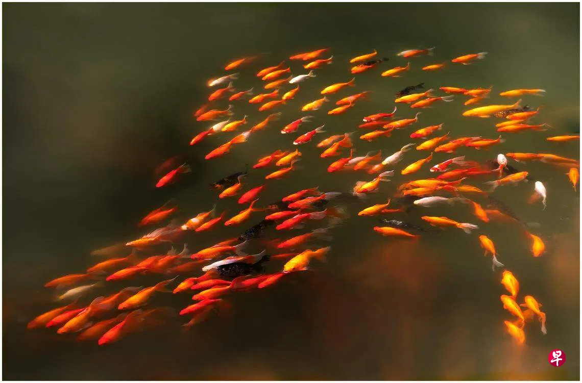 为了抓拍到一张预想好的构图,这天我整整守了一个下午。或许有人会觉得这种无聊的等待有什么乐趣?我会坦然地答道:子非鱼,安知鱼之乐?我的确是很享受这过程的,不管最终能不能如愿以偿。看着这一大群的鲤鱼逍遥自在,一会儿绕圆圈,一会儿走S-线,想必快乐无比!庄子《秋水篇》里的惠子问道:子非鱼,安知鱼之乐?庄子答道:子非我,安知我不知鱼之乐?庄子在观鱼的同时点出人们都有的各自价值观与生活盲点。想不到通过观鱼之乐,也能找到一种开放与追求生活快乐的心态!