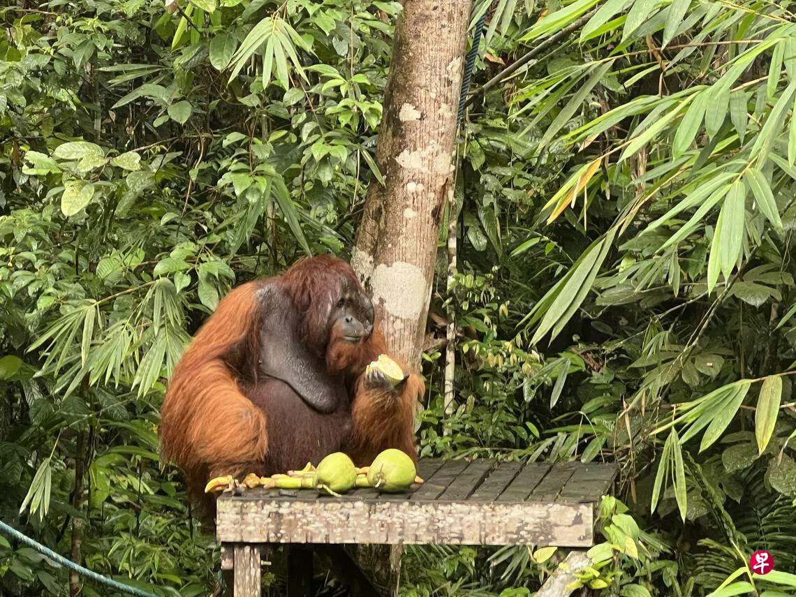 向导停下脚步,抬头看,十几米的高处,坐着就是我们此行想要探寻的主角——砂拉越红毛猩猩。这全世界最大的树栖哺乳动物,看它也有100公斤重吧,站立时可达1.4米,看起来笨重,但却又能灵巧地,利用长而有力的手臂,在树和树之间,找出一条路线。红毛猩猩其实过着独居的生活,它生存的本事源自母亲的指导。小猩猩自出生后会跟着妈妈一起生活到四五岁,直到能完全独立为止。