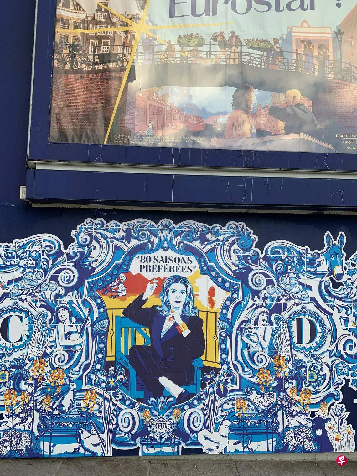 法国人其实也很八卦,不过更擅长弄虚作假,譬如国宝级电影明星嘉芙莲丹露(Catherine Deneuve,也译凯萨琳丹妮芙)城中香闺所在地,是个公开的秘密,然而大家走过都特别装出一副视而不见的冷漠表情,以免显得脚上带着牛屎。住宅楼下一幅外墙,大约七八年前开始被一个街头涂鸦艺术家当作“丹露墙”,小小的贴画以楼上住客作主角,隔几个月更新,画中人出出入入不会没有看见,也从来不曾大吵大闹搬出什么“肖像权”控之告之。去年十月艺术家忽然一反常态,作品尺寸数以倍增,占了几乎整面墙,仔细一看中间题字“八十个心爱季节”,才省悟当天是美人八十大寿——她其中一部代表作叫《我心爱的季节》。