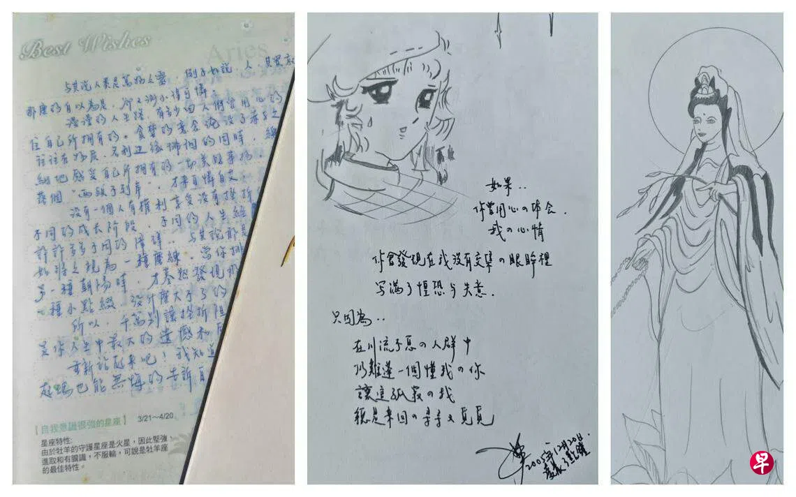 有一天,老公从旧家拿回了三本小册子,他露出好奇的微笑,难以置信地问:“这是你的字迹吗?”我愣了一下,视线被这几本小册子吸引着……满满的回忆涌上心头。我缓缓打开册子,里面写满当年的心情语录,有些像日记,有些像歌词,还有一些诗词,最令我自己惊讶的是,还有随笔涂鸦的画迹,我竟然……会画画?