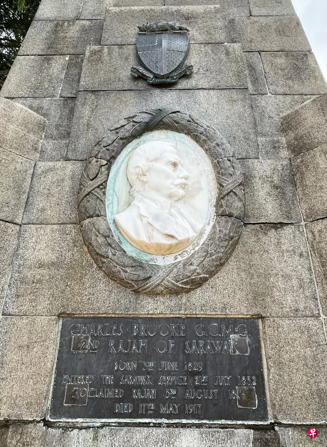 在古晋总能听到布鲁克的名字,这个统治砂拉越长达105年(1841-1946)的英国家族,称为白人拉惹(White Rajahs)。旧法庭前竖立着第二代拉惹查尔斯·布鲁克的纪念碑,正面镶嵌其白色大理石浮雕肖像,上方是其家族徽章,纪念碑下部四面各镶嵌一青铜碑记,分别以四种文字书写,其中华文以竖排繁体写道:“砂拉越王查士巫禄碑志:王生于一千八百二十九年六月三号,任为越吏于一千八百五十二年七月二十号,嗣王位于一千八百六十八年八月三号,薨于一千九百一十七年五月十七号。”纪念碑的四角镶嵌代表四大族群的青铜浮雕,三名土著是昂首赤足的阳刚彪悍形象,一名华人却是顶戴花翎长袍马褂的满清官吏模样。
