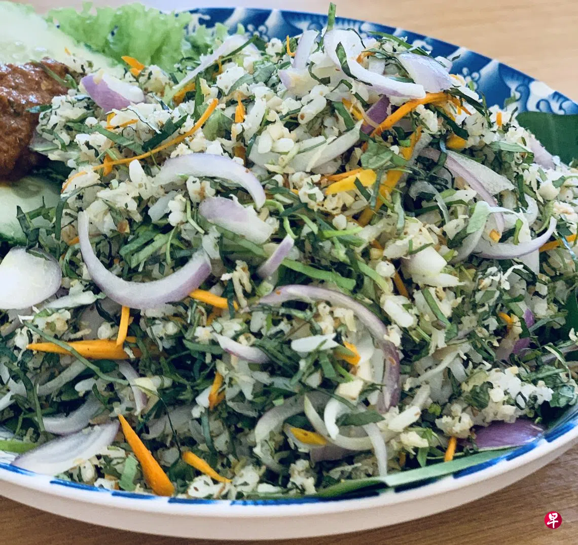 槟城因为邻近泰国,娘惹味也多了一抹酸辣。这也是我第一次品尝到Nasi Ulam(叶菜饭)这道做工繁复的菜。饭粒上点缀着花花绿绿,赏心悦目极了,准备时要剁细那么多种食材,也是费劲的。但好的事物,就是由各种大小麻烦所构成,只有重视成品的完美,才愿意投入时间一一解决这些麻烦事。我们现在都知道餐馆里的菜品及调料等,都是大厨Gaik Lean由零开始准备的。好菜里都是时间、时间和时间,无他。