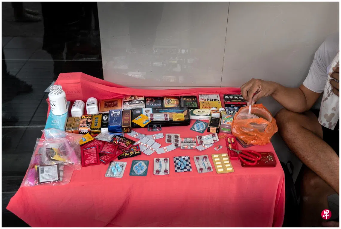 有趣的是在芽笼路的一角有两三个摆摊卖春药的小贩,他们都是来自广州的年轻人。有一回与其中一个交谈,方知他们共有十几个人轮班在芽笼的街角摆摊,兜售从中国带来的春药。他们将各种春药摆放在一块大约一米方形的布上,将布展开在一个空纸盒上,就是他们的摊位。当收摊时,他们只需将布的四个角提起来,便可收起来离开。他们似乎对执法者有所防备,有时还要玩起“猫捉老鼠”的游戏。我好奇地站在三四米外观察,想看看这些春药的购买者到底是谁。果然,在过了30分钟后,我看到一名女性顾客走了过去,兴趣盎然地购买了一些春药。