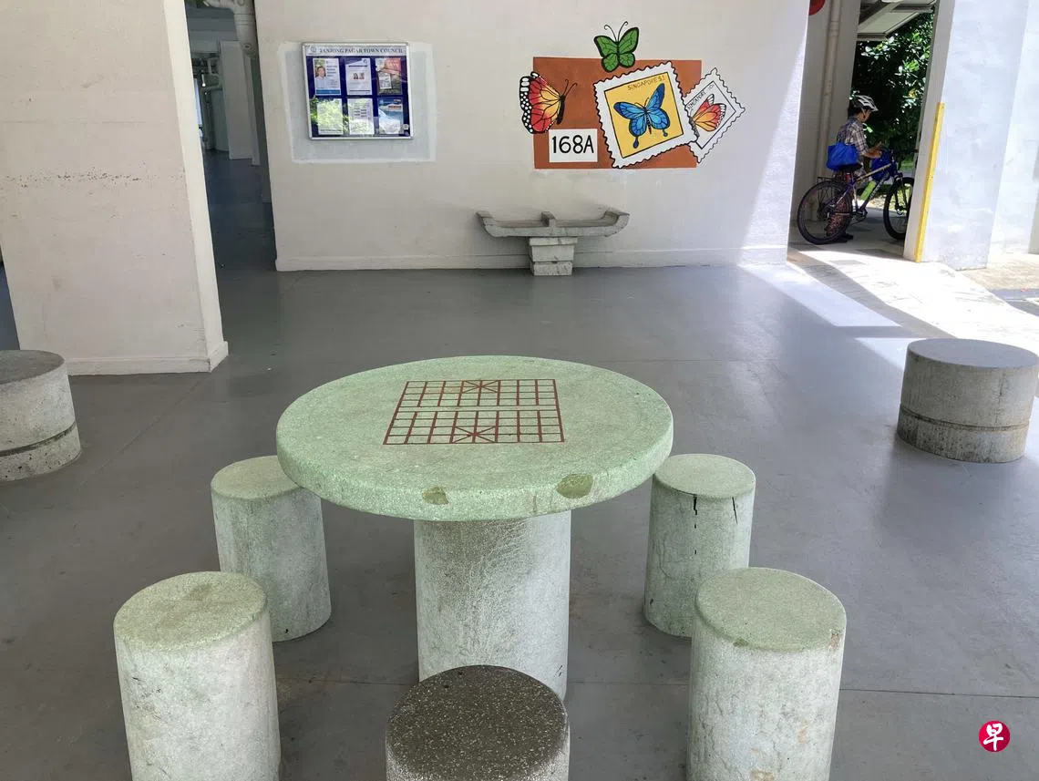 最初的组屋底层简单多,不就是几个典型的浅绿色圆桌和圆椅,而且桌上皆有中国棋或西洋棋棋盘,供居民在此消遣。有趣的是,如此贴心的设计却甚少看到居民有雅兴下棋呢。