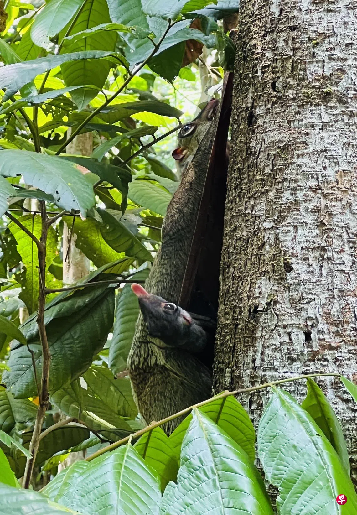 我在射靶场自然公园里一条热闹的小径上,看见一只马来猫猴妈妈,怀抱着小小猫猴,紧紧抓住树干。它身上的毛发,棕中带绿,几乎和树干融为一体。身边的小孩,似乎比大人更理解它。“那是马来猫猴,它的皮肤膜十分神奇,折成袋状后,可以用来运载宝宝,展开后也能滑翔。猫猴是东南亚的原生种,树栖的夜间动物,喜欢独自行动,经常攀附在树干上,爱吃叶子、花卉和果实。”小孩用颇为专业的术语说。