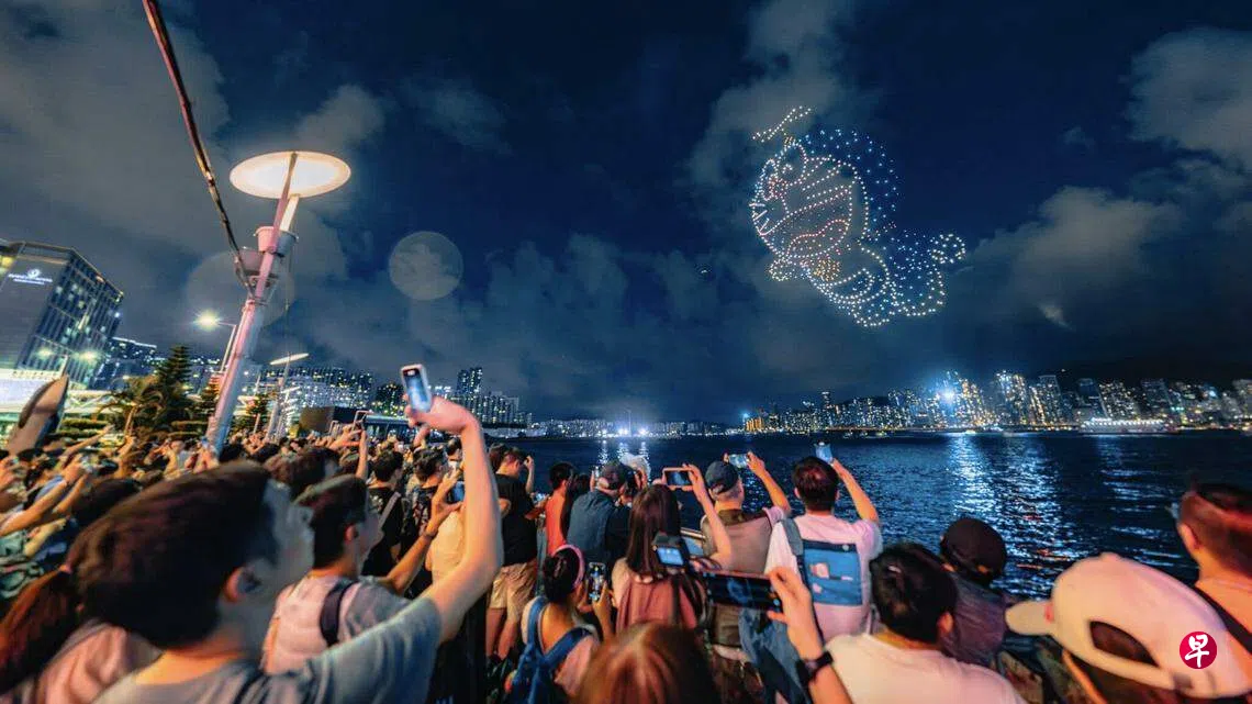 上周六(20日)在香港维港一带看了很棒的无人机演出。夜空中出现巨型哆啦A梦,闪闪发光,梦幻极了。非常认同站在我身后的人父对孩子说的话,他说:“依家(粤语,意指现在)的科技好犀利啊!”