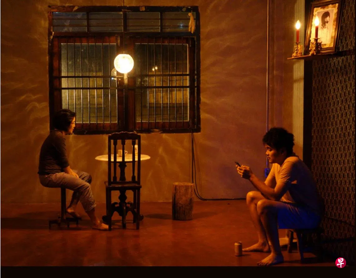 滨海艺术中心的黑箱剧场里,昏暗的舞台上打着微灯的地方,一个男人和一个女人隔着一张桌子坐着。男的只顾低头滑手机,女的百般无聊地坐着,时不时揉鼻子还把鼻涕抹在桌上。两人的眼神几乎不曾相遇。观众席上每个座位上都放了一张红底金箔的纸钱,暗示着这是个关于华人和死亡的故事。