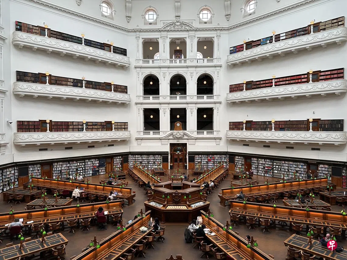 走进维多利亚州立图书馆(State Library Victoria)阅览室,抬头看见穹顶天窗晒下春日晨光,时间在这一刻放缓了。登门入室之前,我还想着这一天还要逛南墨尔本市集、St Kilda海滩,最好晚餐前还跑一趟购物街Chapel St打卡……这座拥有约170年历史、世界最早对外免费开放图书馆之一的老建筑却让人暂时忘记了室外的世界。