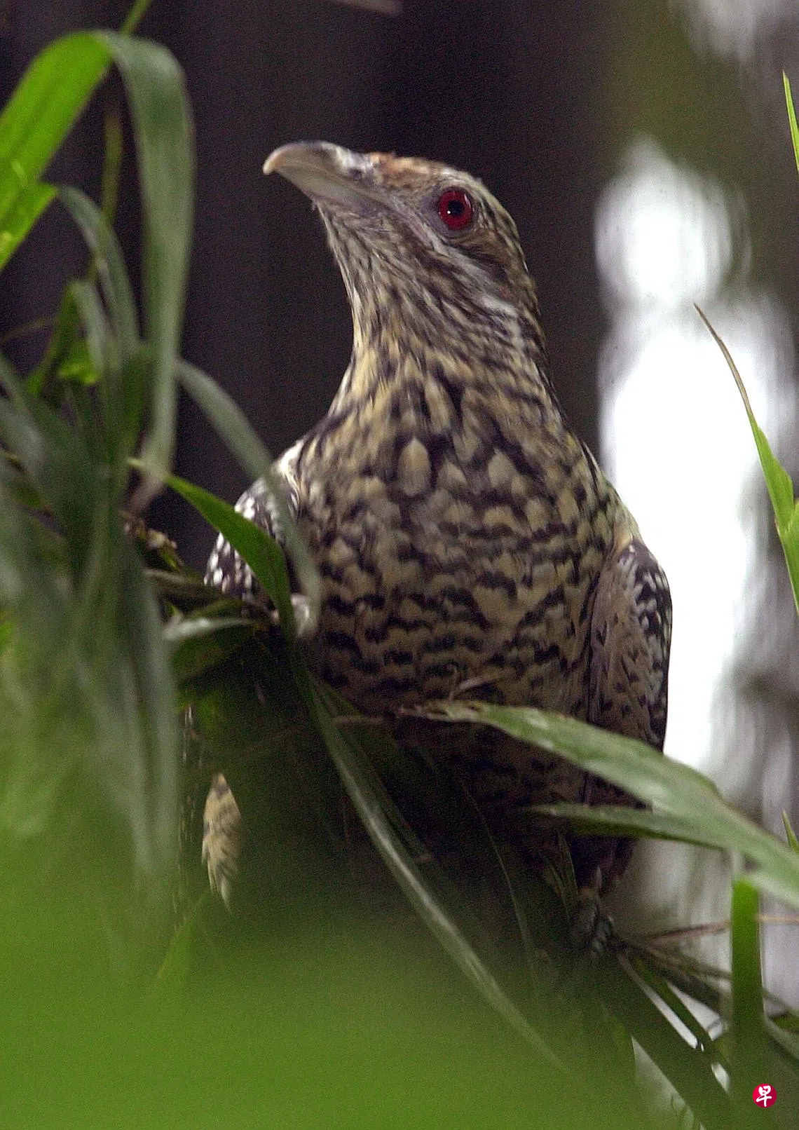 雄聒鹃和乌鸦相似,披一身黑衣裳,鸟喙粗壮呈绿色,但有一双血红色的眼睛。雌鸟色彩虽然暗淡,但长得更有层次,深褐色的羽毛,上半身带有白色斑点,下半身则有漂亮的条纹。