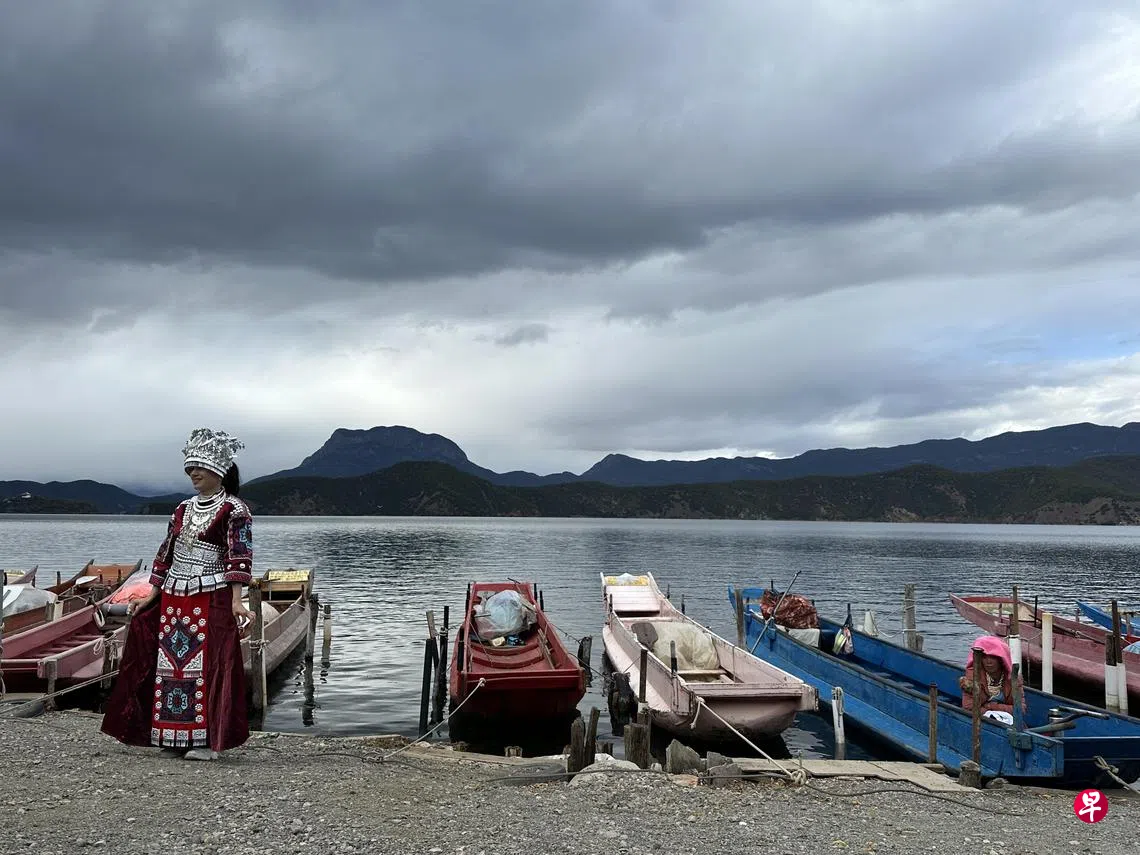 当我们坐船回到泸沽湖畔,穿着少数民族服饰的团员轮流拍起了照。当地旅行社免费提供服饰与照相服务,头饰首饰则另付费,让游客更能“身历其境”。在停泊的猪槽船旁,看似凝望待客的当地妇女一身羽绒服、裙子、牛仔裤与球鞋的现代化装扮,唯有粉红头饰与黝黑皱褶皮肤暗示了她的出身——泸沽湖周边千百年来居住十几个不同的少数民族,我分辨不出。团中三名年轻女游客兴致勃勃以银光闪烁头饰的苗族装扮,摆拍打卡。