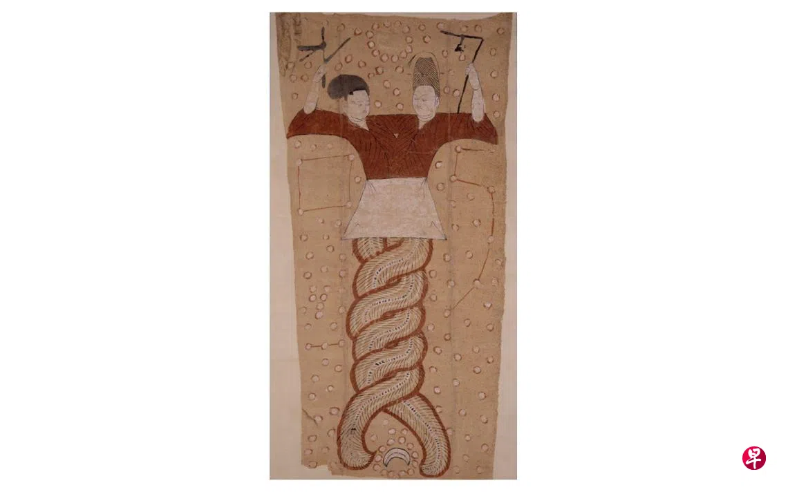 为了在社媒上发布蛇年贺卡拜年,上网搜寻与蛇相关的文物。唐代新疆吐鲁番阿斯塔那墓葬群中大量出现的伏羲女娲图像“跳”了出来——呈T形的人首相拥,袍服下蛇身交尾,惹人注意。中国古代神话传说中,相传创造八卦教人渔猎的人文始祖伏羲持矩,造人补天的创世女神女娲持规,上绘太阳,下绘月亮,周边布满星辰。这些作于麴(qū)氏高昌和唐西州时期的绢本设色绘像典雅耐看。