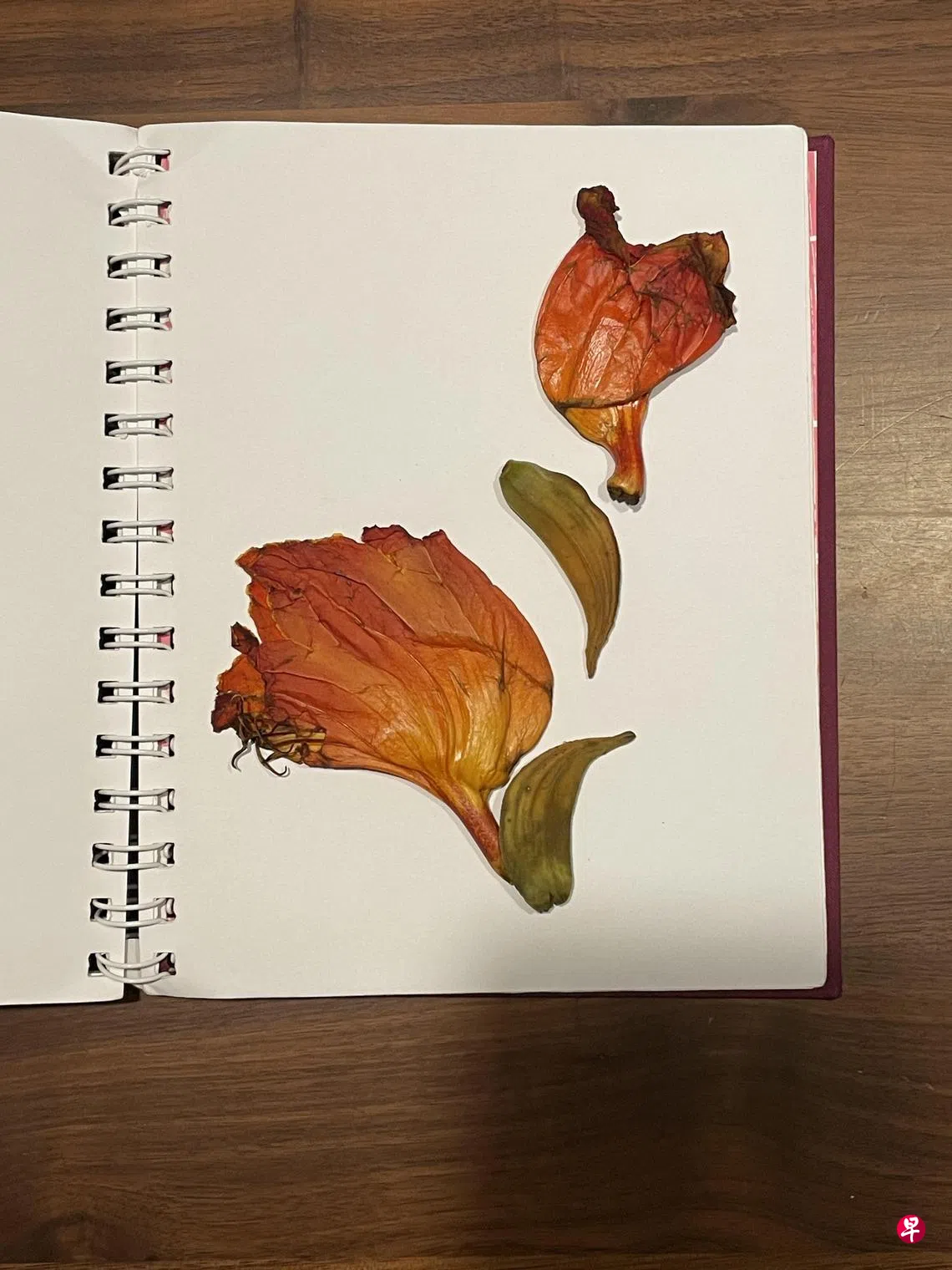 章星虹:落花订户赠阅文章笔记本里夹着两朵火焰花。 (作者提供)“你们看,火焰花!”她转过头去,映入眼帘的是一朵红色落花,躺在同伴摊开的手掌上。 接近正午的阳光,从头顶上浓密的叶隙间肆意洒下,一缕光束如同舞台上的聚光灯,打在掌心的这朵花上。 这是她第一次近距离细看火焰花。红中带橙的花身,在阳光下变得有点透明,隐约能看到花瓣裹着的花蕊。花瓣表面似有一层蜡质,锁住了盛放时的那份丰腴,花柄下还带着一个半月形剑鞘般的小花托。相遇四方八面上一篇蔚铿:归途下一篇刘慧慧:春分际遇