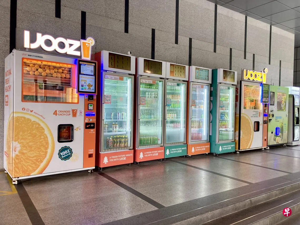 除了最普遍的罐装饮料,还有鲜榨橙汁、咖啡、抹茶、沙拉、零食、宝可梦游戏卡等贩卖机。比较特殊的就有售卖鲜花、鲜鲑鱼、鲜榴梿贩卖机。最近在牛车水唐城坊还看到售卖收藏版的模型巴士贩卖机,真是层出不穷。几年前做家访时,在某组屋区底层较隐蔽的角落看到售卖安全套的贩卖机,当下有些惊讶。