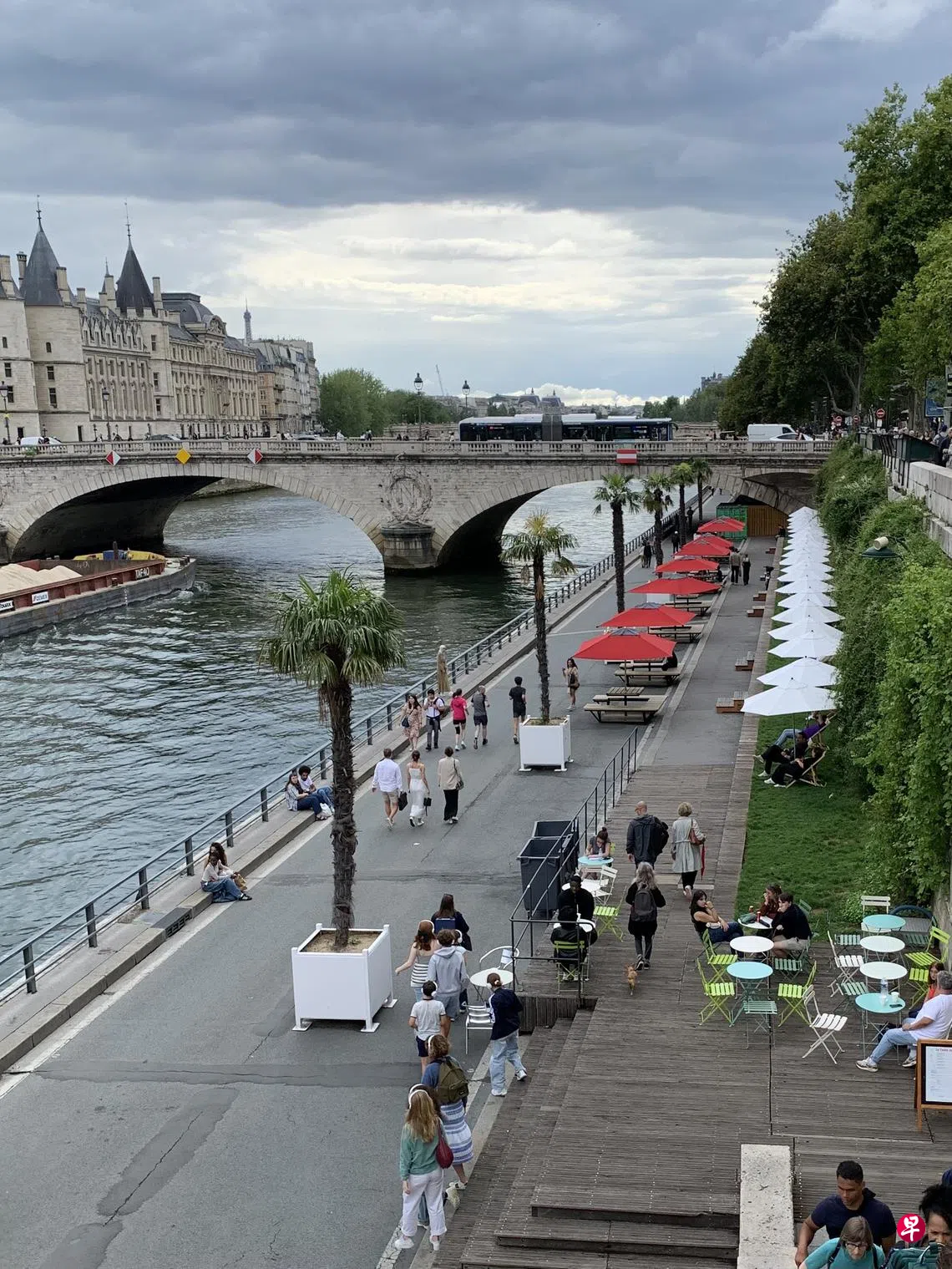 因为环境污染,百年以来塞纳河禁泳,日光浴晒到香汗淋漓,见水而不能游未免遗憾,虽然电影《祖与占》里任性的珍摩露(Jeanne Moreau)示范过纵身一跃,到底是犯法的。拜去年奥运水上运动在河中举行所赐,政府耗资天文数字进行清洁水域工程,今年终于岀现大突破,设立了三个泳区让市民和游客下水,蛙式蝶式狗仔式悉随尊便。
