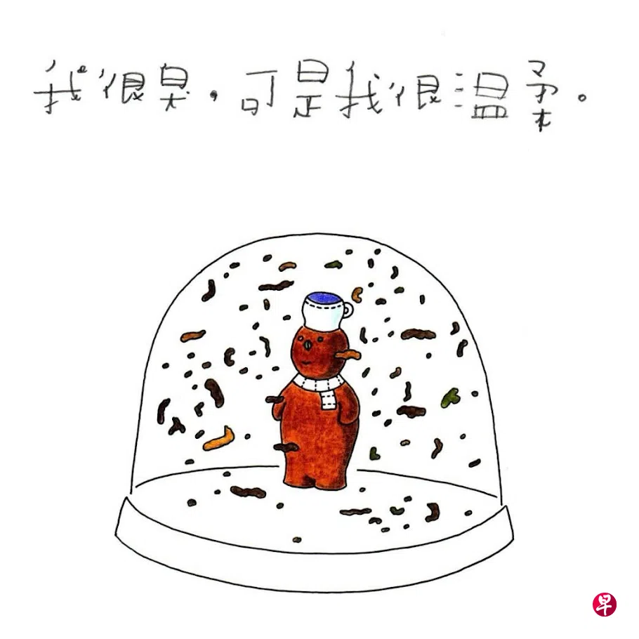 所以这本书的扉页印有一个危险标志,标志底下有一行字:“Keep out of reach of adults”(好吧,还没有长大的大人除外)。所以我把夏宇那首没有一个字是我认识的《降灵会III》译成英文(我这辈子译过最好的一首诗)。所以书里收录了一首露骨的情诗(两只手被铐在一起的X光照);一份熊式族谱(一张熊科动物演化图示);一本失忆者的回忆录(整本书都是空白的);另有一个“屎花球”设计图(献给所有屎捞人的fan屎)。屎捞人是谢立文向英国绘本家Raymond Briggs的绘本《雪人》(The Snowman)最温柔的致敬,所以我为屎捞人设计了这样核突的水晶球,甚至发白日梦把这个点子卖给谢立文屎捞一笔。跟这本书重新相遇让我感慨青春无耻。