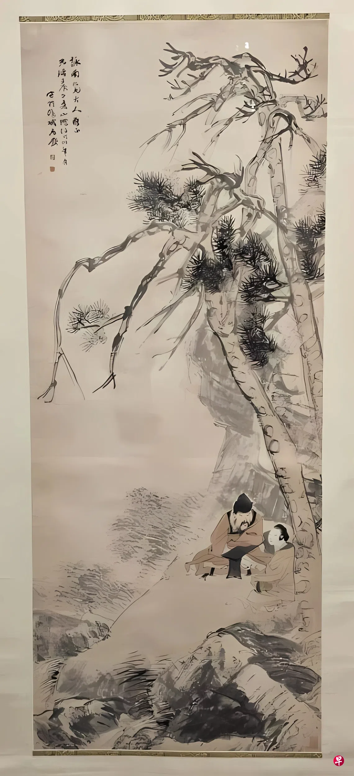 画面上方是一株高挺的松树,树干盘曲遒劲,枝叶以水墨描绘,浓淡相间,展现出松树坚韧不屈的生命力。背景的山石用淡墨皴擦,营造深远幽静的山林意境。画面的下方,苏东坡伏几与一位女性相对而坐,似在谈话。人物衣袍以淡赭、浅粉等色轻染,柔和地与墨色山石形成对比。