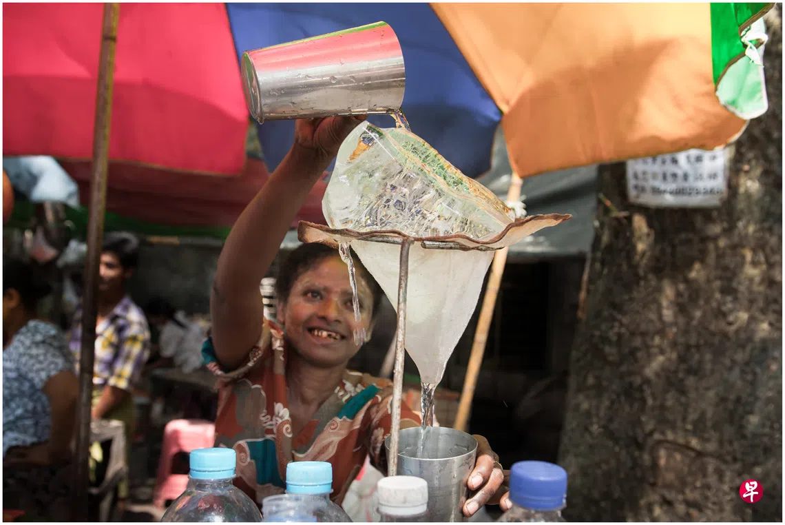 在缅甸仰光的一个菜市场,我随朋友走入人潮中,不经意地遇见一名卖冰水的小贩。