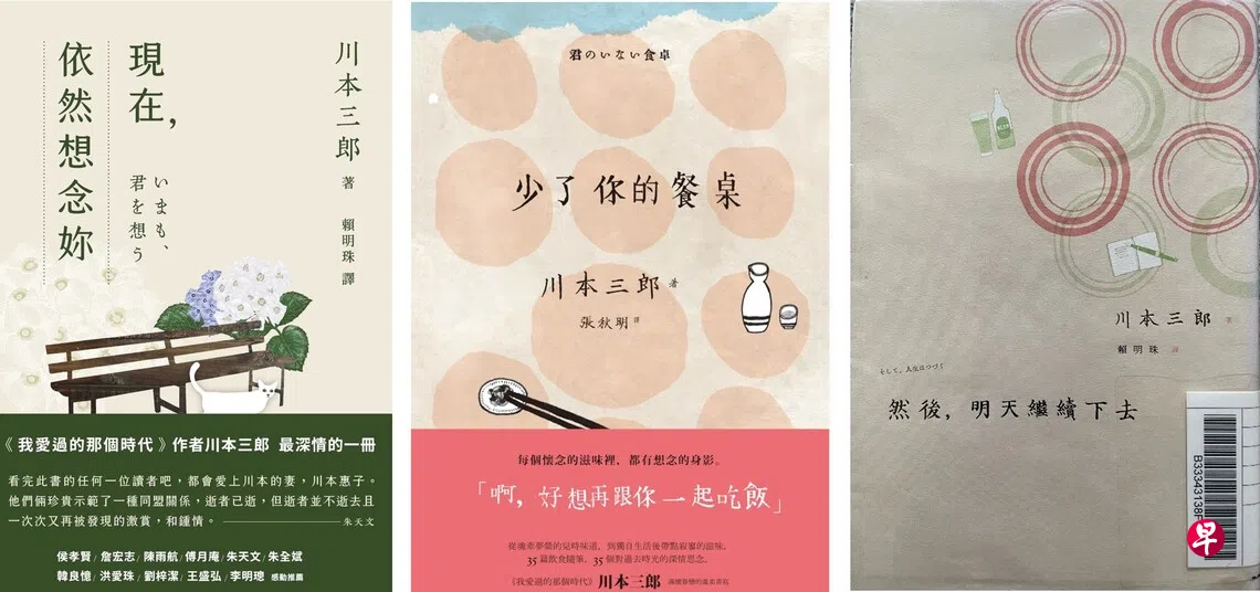 “留下的人”这个念头,让我想起不久前读完的三部随笔散文集,作者是日本知名文化评论家、散文家川本三郎。川本先生此前著有《我爱过的那个时代》《遇见老东京》等,早年也是推介村上春树作品的评论人之一。然而在2010-2012年三年间他连续出版了三本随笔散文集(见图),书写风格却截然不同,让人看到了他少为人知的一面,读者也到此时才知道,他的太太川本惠子因罹患食道癌,已于2008年去世,离世时57岁。