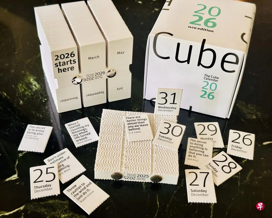 一个魔方日历(The Cube Calendar),出自荷兰设计师Philip Stroomberg之手。日历分上下两层,每层三列,每列两个月;每天一张小卡片,背面留白。每隔三五天,会出现一张名人名言。句子很短,略带鸡汤,却不刻意励志,大多是那种:看完不会立刻改变什么,却会让你在喝咖啡时,多停留几秒的文字。
