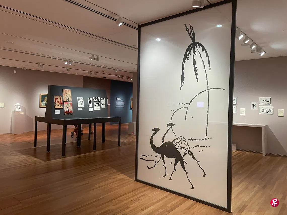 走进展厅,首先留意到的是大型展板上两头在沙漠中跋涉的骆驼,出自画家早年为《叻报·椰晖》所作的版头画和前言,此次特展也由此而得名:“为此,骆驼出来了。虽则,脚步恁般迂缓,样子这么笨滞;但是它,纵使前途有沙,尘……还是负着重大的使命,一步一步地前进,永远没有倦意。”