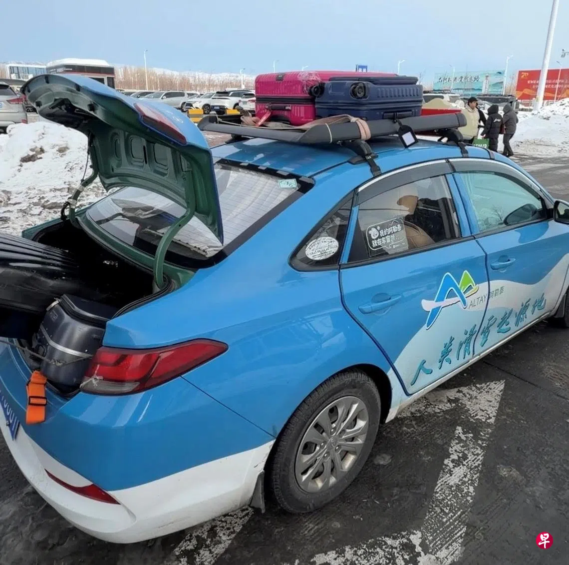 阿勒泰机场很小,只有一个行李转盘,所有航班共用一个出口。本来想用打车应用,发现根本没有车响应,只好在机场外叫出租车。当地人站在外头问要不要租车,很快帮我们安排了一辆。行李被随意放在车顶上,后车厢甚至没完全关好,车就开走了。