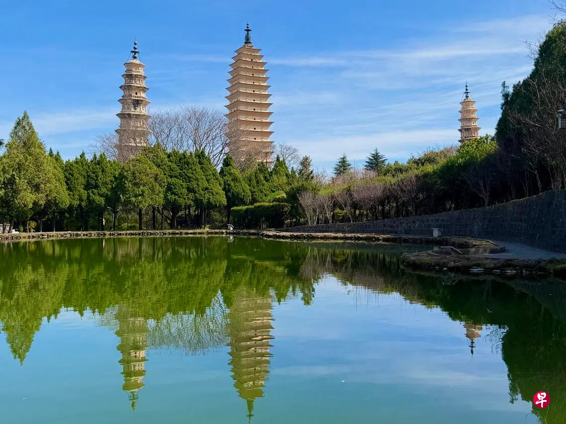 公路的尽头,此行目的地悄然显现——崇圣寺。在苍山洱海之间,山麓平原之界,三座佛塔如武侠小说里的高僧现世,不喧不扰却气象万千。居中者沉稳如山,两侧者护法肃立,天地仿佛一座被山海托起的巨大禅堂。