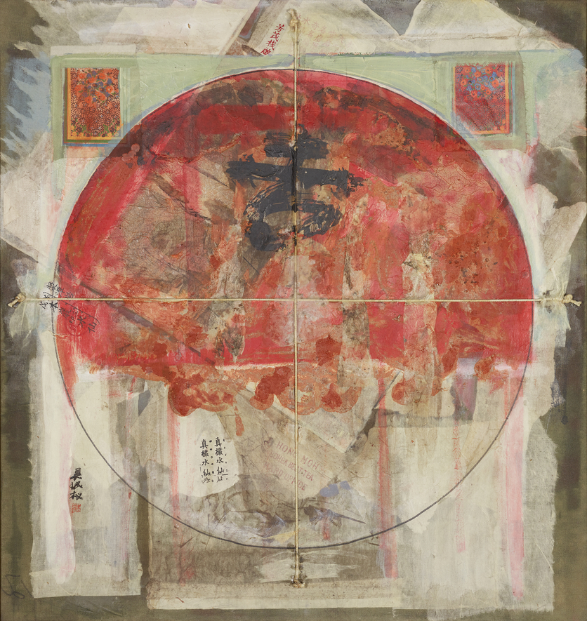 展厅B的艺术家对媒介敏感,以拼贴作品闻名的艺术家吴珉权(84岁)将日常生活的素材,包括茶包、线、蜡、浆糊、布料、装饰纸,与水墨、油彩,运用在1980年代的拼贴作《风水》中。《黑色下午》(1963)借红黑色彩与抽象线条,是当时留美的吴珉权听到美国肯尼迪总统暗杀身亡的记录。吴珉权回新后住在牛车水,1970年代的《市区重建》系列反映被铁丝网框住的窗口,暗喻都市化发展后店屋被拆的厄运。