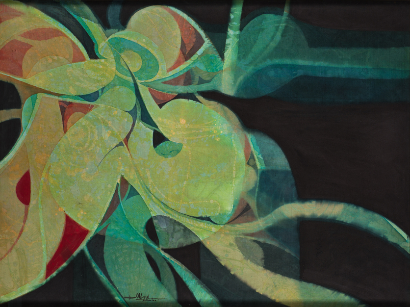 随着电脑普及,借助科技做艺术表达是马来裔艺术家惹化·拉迪夫(Jaafar Latiff,1937-2007)和林欣欣的共同点。留日的拉迪夫革新传统蜡染的具象画,将之发展为抽象化的亚克力画,更自在挥洒地表达,《视野》系列捕捉都市化之后,快节奏的生活步伐与混乱能量。拉迪夫后期还使用电脑创作。