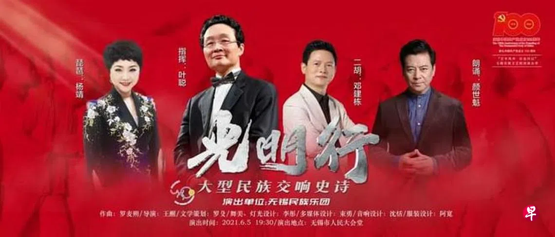 《光明行》是刘天华1931年创作的二胡独奏曲。乐曲以振奋、激昂、蓬勃向上的情绪著称,是五四时代罕见具有汉民族气息的进行曲。这部交响史诗正是意在表现从晚清至20世纪初叶,国民与知识分子对国家命运的担忧和对救亡图存道路的探索。不过叶聪指出,无锡也是吴文化、太湖文化的中心,这部作品除了大时代的风起云涌,也不无流露着江南特有的人文气息。