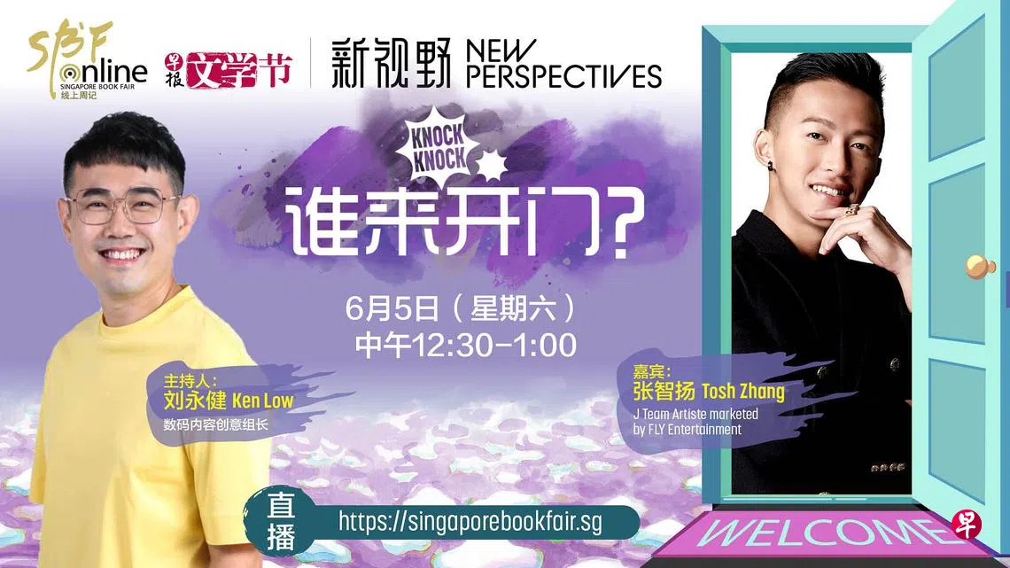 新加坡书展2021推出“谁来开门?”午餐谈话性直播节目,九位各行各业的名人将说出他们的切身经历。他们包括前议员李美花、台湾导演彭文淳、美食博客欧倩慧(Miss Tam Chiak)、帅哥名厨胡敬恒、实践剧场艺术总监郭践红、新加坡华乐团副指挥倪恩辉,和本地艺人李凯馨、张智扬(Tosh)与赵彩菱都将分享如何在疫情下度日。