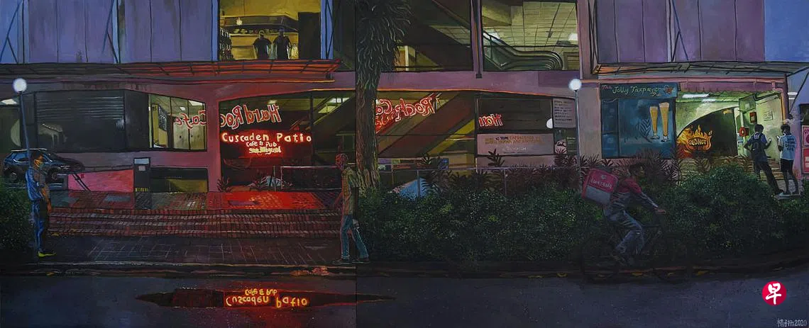 四年前,杨子扬举办个展“黄昏”,这次办“又见黄昏”,展出这两年完成的31幅作品。这位27岁的全职画家观察傍晚6时30分至晚上8时,又热又亮,快暗下来的天色,城市里上班的读书的,到咖啡店用晚餐或打包,搭巴士或地铁回家的日常情景。