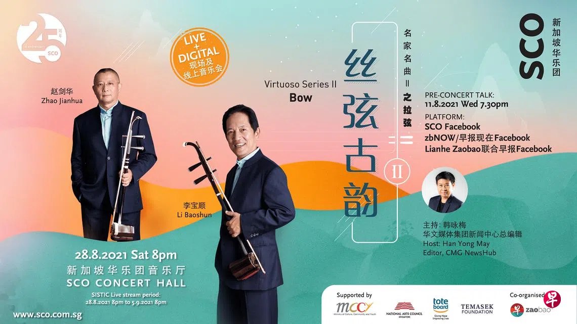 由新加坡华乐团推出的“名家名曲”系列音乐会与讲座,本月进入第二个主题“丝弦古韵”。乐团首席李宝顺(高胡)和二胡首席赵剑华将作为主角,呈献胡琴家族所蕴藏的深厚魅力。