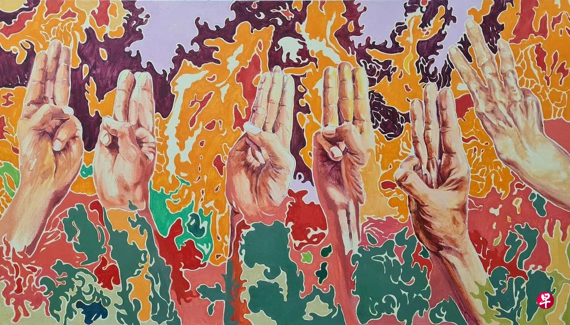 缅甸艺术家办群展 筹款支援祖国订户赠阅文章画家巫思远描绘三指礼的油画《风雨同舟,乘风破浪》。图片由主办方提供缅甸今年2月发生政变,局势动荡不安,加上疫情恶化,使得定居新加坡11年的缅甸艺术家念苏(Nyein Su)忧心忡忡。念苏(40岁)接受《联合早报》访问时说,她住在仰光的家人都确诊冠病,当地医院缺乏医生护士,只能在家治疗。父母渡过难关,高龄祖母仍在挣扎求存。同时,军政府派人到每家每户做“人口普查”,拿着住户名单一一核对,借以逮捕参与示威行动的可疑分子。缅甸新加坡菲律宾艺术家展览南洋艺术学院慈善机构上一篇天猛公首个夜间展览 本地创意人诠释传统下一篇艺联剧团翻演《再别康桥》购买此文章