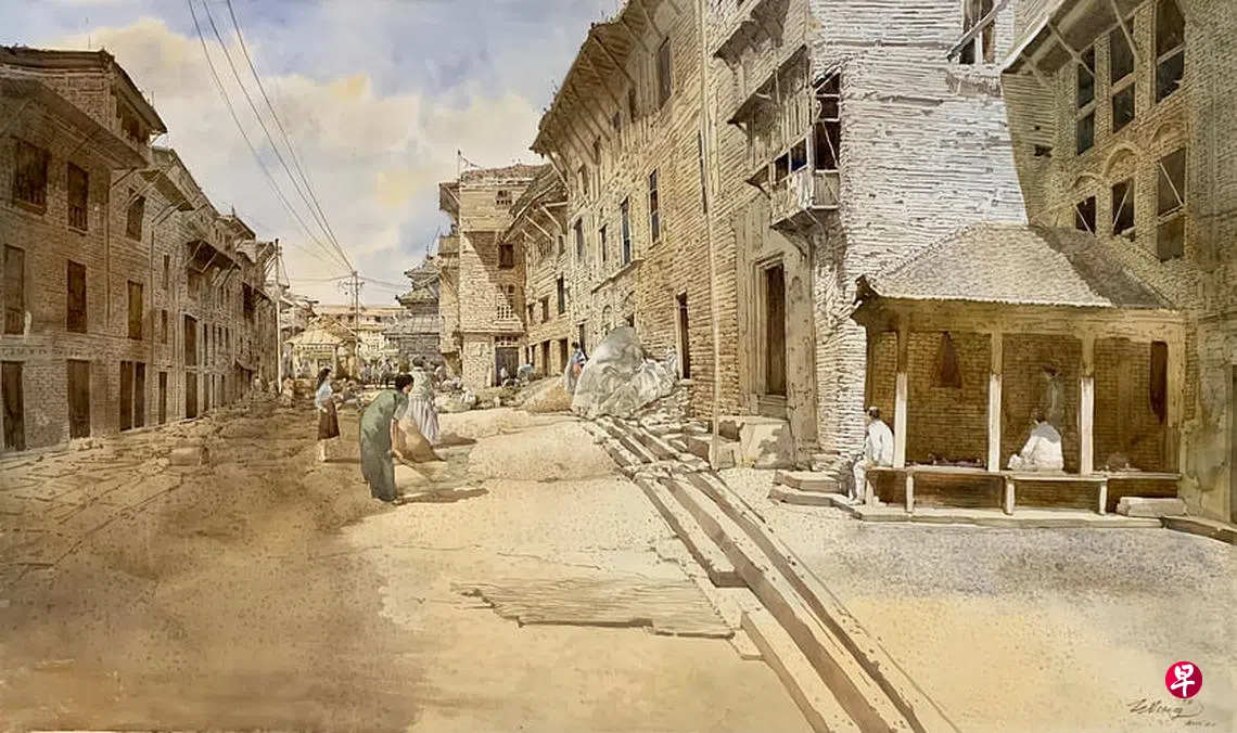 这次展出的最大幅水彩画约2米长,也是王金成第一次以尼泊尔为题材的大尺幅画,他之前画过新加坡河和峇厘岛风景。这幅《尼泊尔巴克塔普尔的公共庭院》(2019,尺寸200乘120厘米),很多细节比以前更细腻。