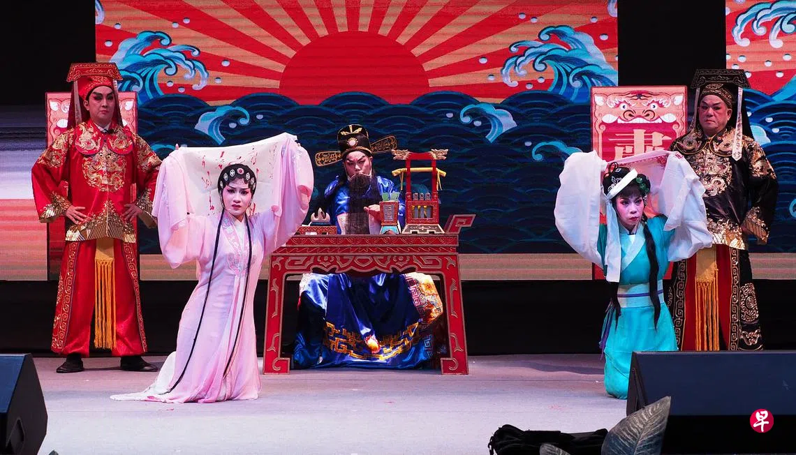 由新加坡潮州八邑会馆主办的潮州节,重头戏是潮州文化中最具代表性的潮剧。第三届潮州节因疫情搬到线上举行,负责在虚拟村潮州村搭建戏台的南华潮剧社,除了在线上播放数量可观的潮剧、潮曲、潮乐视频,还安排了一场实体演出《传薪》。