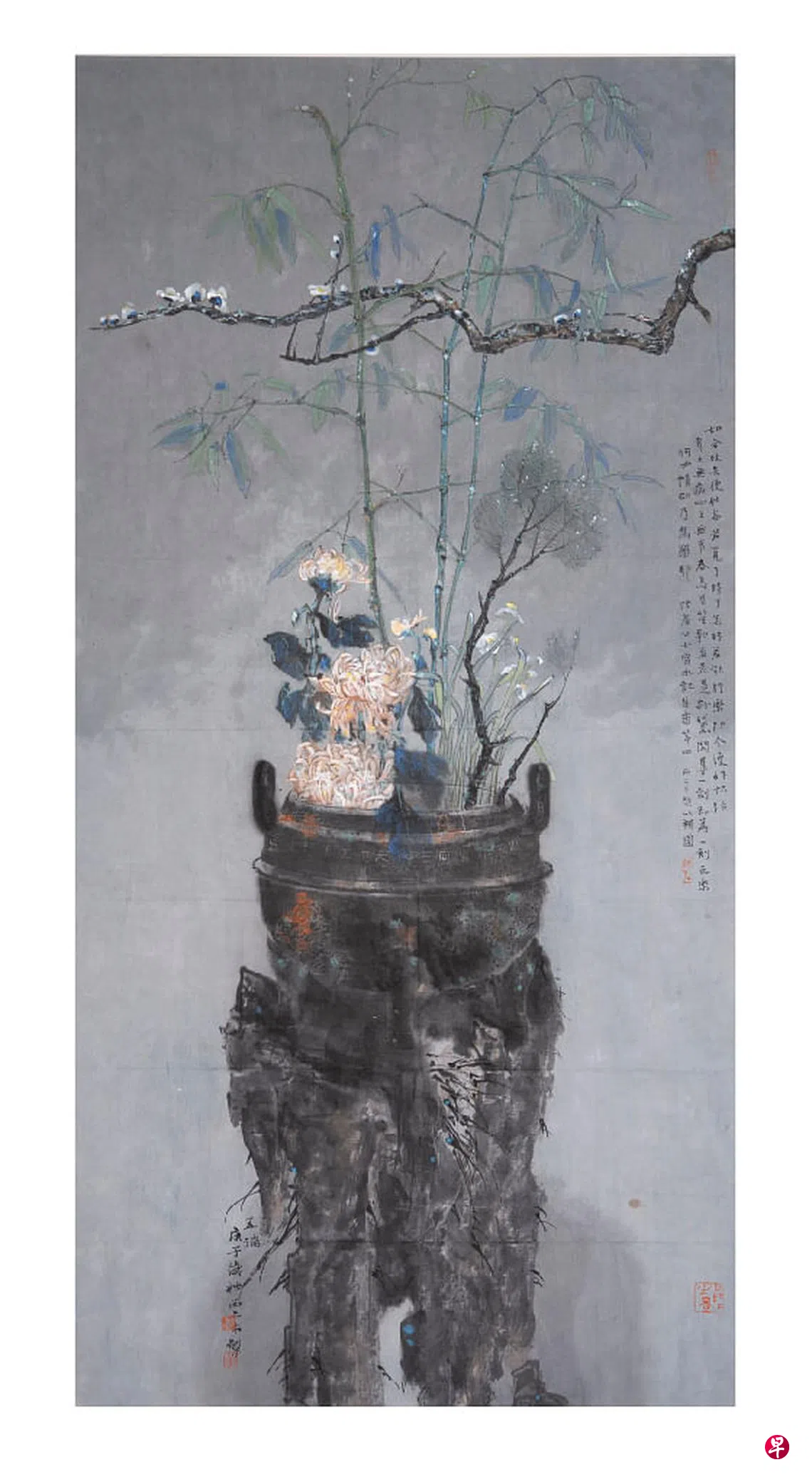 至于绘画,戴文标从一些古代器物如砖瓦研台、铜器的拓片,配以一些日常时节易见的花草静物。他说:“日子如风,静心之下,也能对平常被忽略的小事物,起一种关怀心。虽然疫情局限了人的行动,但也把人对外的探求野心转向自省,对自己、家人,甚至先贤们。‘意与古会’是我在这段时间对书画印章的小总结,虽然说思古幽情居多,何不是成长中对自我与社会历史文化上的反思?”