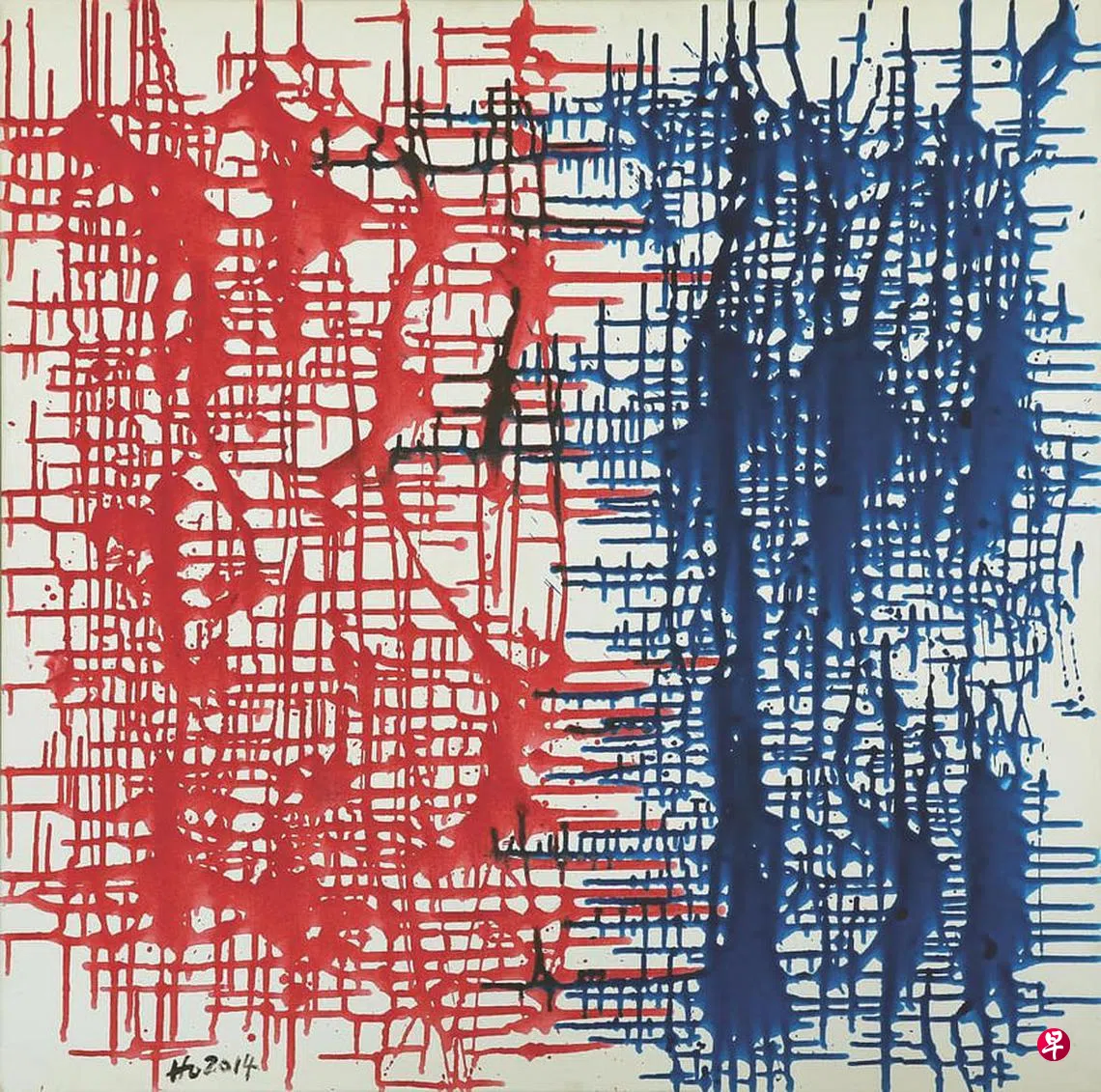 这是文化奖得主何和应第九次个展。他师从陈文希与刘抗,从具象油画出发,早年展出《房间》《我的父亲》等作品,后来认为抽象艺术更有想象力,是更能体现出新情感、新思想的新型艺术,一生追逐“线条的生命,笔触的精神,色调的奥妙,结构的超脱”。他以抽象表现主义艺术闻名,油彩颜料的滴落、缓慢流动、泼色、形式与笔触形成个人风格。